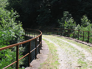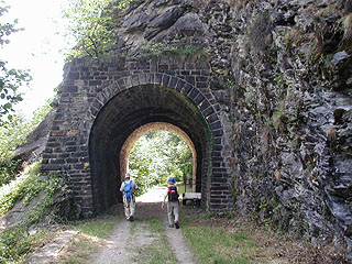 メゾッコの郵便バス停車場/鉄道駅跡(このページ冒頭の写真)から、南に向かって100mほど舗装道路を歩くとハイキング用の黄色い標識が出てくるので、その中のSoazza ソアッツァという表示に従って、軌道跡に入る。隣村のソアッツァまではゆっくり歩いても1時間少々といったところ。明るい森の中のハイキングコースだ。