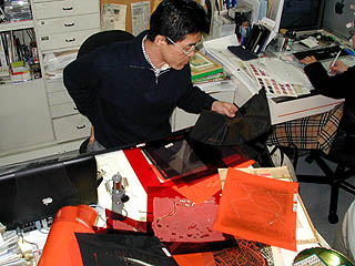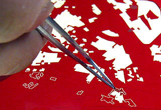 次に、線版の作図現場。筆者たちも経験してきた「スクライブ」だ。これは、透明なフィルムの表面に敷いたオレンジ色の薄い被膜(スクライブベース)を、様々な太さの針で削り取り、線版を作る作業である。この「スクライブ」作業は、製図ペンやカラス口などのようなインクを使った製図よりも、はるかにシャープな線が得られる。