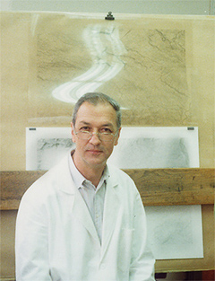 「最近はコンピュータ画像がもてはやされているけれど、やっぱり手が一番だね。例えば、数値画像では、設定した光の入射方向と山脈の流れの方向が一致してしまうと、山脈が消滅しちゃうじゃないか。それに、地形全体を理解するうえで妨げになるような、変な陰影が現れることもあるし。手ならそんなことはない。地図の目的っていうのはそもそも、それを見て、地形を把握することにあるのであって、いくら物理的に完璧に正確って言ったって、あんな分かりにくいもの見せられたくはないね」