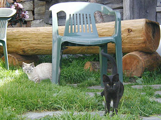 Sさんのお宅の場合、8匹の猫のうち、ルファーとトゥーラは人間と同じ部屋に住む「家猫=ペット」で、残りが「ネズミ捕り猫」ということになっている。ネズミ捕り猫たちは基本的に居室には入らず、納屋やガレージなど思い思いの場所に寝床を取り、半野生の生活を送っている(ネズミを捕らなくなるので、ネズミ捕り猫に餌をやらないという人もいるが、Sさんの家では一応ネズミ捕り猫たちにもカリカリ餌だけ与えている)。彼らは家猫ほど人懐こくないが、Sさんや奥さんが外にいる時など、しばしば獲物をくわえて自慢しに来るところを見ると、自分たちとSさんたちとの関係をよく理解しているのだろうか?