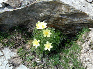 道は時々じくじく湿った部分を通ったりもするが、特に歩きにくいような箇所や急登もなく、歩きはじめから30分かかるか、かからないかという程度で小池の点在する浅いカールの底に到着する。相変わらず花も豊富で、ちょっと気が早いが小休止するのにいい感じの場所だ。ただしこのカール底から、道は池や湿地、小川を避けるように、いくつもに枝別れして縦横無尽に広がってしまうことに注意したい。ここで道を間違えるとピッツ・ラガルプの頂上など全く別の方向に向かってしまうので、出発の時にはよく辺りを見回して黄色い標識を見つけ、Fuorcula Minorと書いてある方向に進もう。岩のペンキ印にも注目。