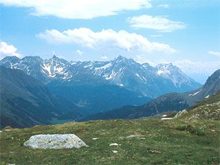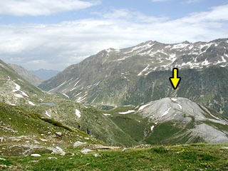 標識から少し登り、小さな尾根のハナを曲がってカールと別れると周囲の風景は一変する。氷河を抱いたベルニナ山塊とみずみずしいお花畑に別れを告げ、周囲は乾いたガレ場と草付きの急斜面、それに今まで見えなかったポスキアーヴォ川源流部の深い谷が見渡せるようになる。この長大な谷にはイタリアのリビーニョ方面へ抜ける街道が通っているのだが、国境近い谷の常で人気があまり感じられず、正面の乾燥し切った山脈の壁と相まって、非常に寒々しい印象を受ける。もっともこれはこれでかなり魅力的だ。ここからミノール峠まではほとんど標高差がなくなり、小さなアップダウンのくり返しになるが、この項の冒頭に書いた雪渓が登場するのはこの区間なので注意してほしい。
