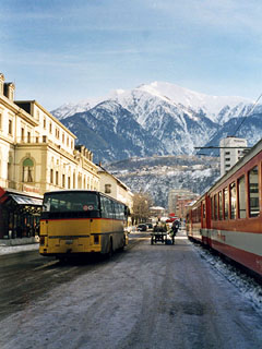筆者の知り合いのスイス人によれば、ブリークのイメージは「洪水」。そういえば、ブリーク駅前でFO/BVZの電車が土砂に埋まっちゃっている映像を、日本のNHKニュースなんかでも数年に1度は見るような気がする。駅のすぐ裏を流れるローヌ川は暴れ川。 |
