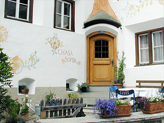 | 現在、筆者の個人的「スイス3大ベストホテル」第1位の座を占めているのが、シュクオルにあるミニホテル、「チャサ・ソフィーア Chasa Sofia」 。ベルンのシュヴァイツァーホフをはじめ、スイス国内の有名ホテルレストランの料理人を勤め上げてきたご主人のギロッティさんが、故郷の生家……正確にはお祖母さんの家を改装して始めた、たった6室だけのホテルだ。