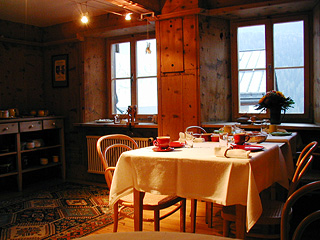 さてさてこのホテル、エンガディン式古民家の味わいを充分に残しつつも、過度の民芸調に流れないよう抑制された外装・内装が印象的だが、これはご主人夫妻の友人の建築家やアーチストがデザインを担当した。(パンフレット、ホームページも共にデザインコンセプトが統一されている)。部屋ごとに構造が違い、セパレートになっていたり、メゾネット風になっていたりと、不揃いなところがいかにも古民家を改装した家らしい。どの室内にもふんだんなリネン類、泉から汲んできた鉱泉のボトルとグラス、ウェルカムフルーツ、アロマポットなどが揃えられ、他にも使いやすい設備、きれいに手入れされた菜園とあずまやのある庭、etc... 家じゅうが細やかな心遣いに満ちている。