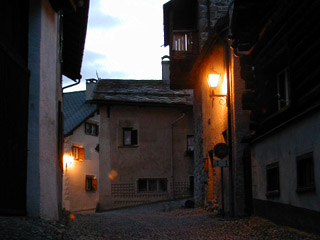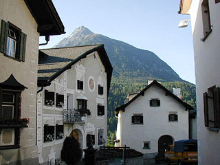 シュクオルの町そのものは古くからある温泉保養地。1日のキツい山行から戻ってきたら、町の中心部にある温泉施設「ボン・エンジャディーナ」の露天温泉で、アーベントロートの山々と、若者たち 及びジッちゃんバッちゃん の水着のおシリでものんびり眺めるのは至福のひととき。とにかく自然に寛げるような雰囲気のいい町で、近代的な利便さと伝統的な町並みやローカル色濃い風俗がうまく同居し(ロマンシュ語の使用人口のなんと多いこと!)、数多い山の町の中でも、飽きのこない点ではピカ一ではないかと思う。