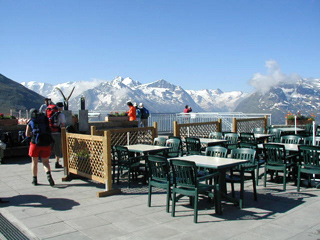 湖を出てすぐ、左手真下に、ゴロ岩にびっしりと埋め尽くされた氷河の末端が見える。氷河というのは流れ下る途上であちこちから落石を集め、ベルトコンベア状態で下流に向けて運ぶため、末端ではこんな風景になるわけだ。ゴロ岩=モレーンが幾筋もの堤防状のうねりとなって堆積していく様子は、現在の日本の山では見られない面白い光景だ。道は氷河の末端のすぐそばまで降りていくので、こころゆくまで見物しよう。