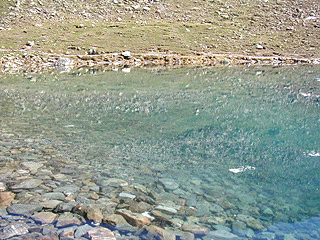 右手遠くに見えていたベルニナの高峰が手前の尾根に隠れて見えなくなり、しばらくすると、進行方向の谷奥にムラーユ氷河の舌状の末端が見えてくる。ここまで来たら最初の目的地・ムラーユ湖は近い。やがて、チャンパーニャ谷への峠 Fuorcula V. Champagna との分岐を示す標識が出てくるので、そのあたりから湖のそばへ下りていこう。