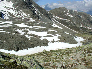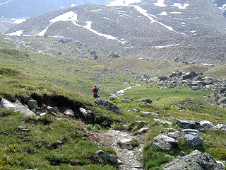 最初は氷河の擦痕がついた羊背岩や、ガレが転々と転がるお花畑の中を行く道を歩いていく。道はなだらかな斜面の脇腹についた、ゆったりとした上り坂で、足場の悪い所はない。大勢の人々が群がって歩くセンガンティーニ・ヒュッテへの道に較べ、こちらは人もポツポツ程度で気分爽快。アルプスを代表する動物のひとつ・警戒心の強いマーモットも、このコースだったらかなり近くで見ることもできるだろう。「ピーフ、ピーフ」という鋭い笛のような鳴き声は、マーモットの警戒信号だ。この声が近かったら、立ち止まってあたりを見回してみよう。