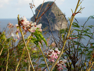 これもまた、島の至るところで見かけるマメ科植物。木本で、樹高5mくらいになる。遠くから見ると、濃いピンク色にけむって山桜のようだった。