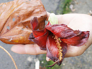 自然保護地域の中で拾ったこの花と葉は、樹高10m以上ある大木のもの。
