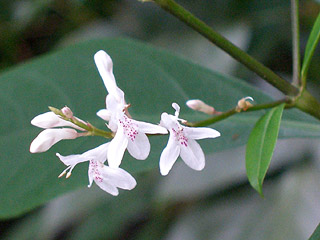 小振りだが、ランを思わせるような美しい花で、林床でよく目立つ。