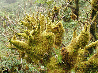 火口壁の中、標高1000mを越えるあたりで見た、コケに覆われた木性シダ。 プレー山の東側は霧が発生しやすい気象状況で、サルオガセに似た着生植物やコケ類が豊富に見られた