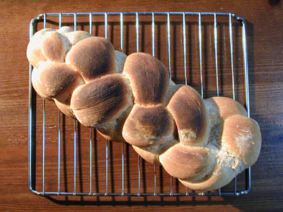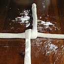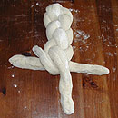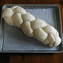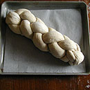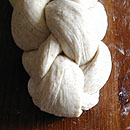 5. 生地をお下げ状に編む(写真参照)。編んだ生地は薄く油を塗った天板に載せ、固く絞った濡れ布巾かラップで覆い、暖かい場所で20〜40分くらい仕上げ発酵させる。