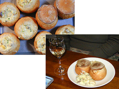 5. 味見をしてみてちょうど良かったらこれで具は出来上がり。くり抜いたパンに詰め(その際、仕上げ用にすこしソース部分を取りわけておく)、180度のオーブンで30〜40分焼く。焼き終わる10分ほど前になったら、パンをくり抜くときに切り取ったフタの部分を乗せ、一緒に焼く。