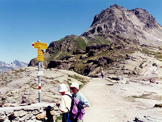 | ムルテルのロープウェー駅からスルレイ峠までは、あまり起伏のないガレ場を歩いたあと、ちょっとだけ登りがあります。下から見ると憂鬱になる所ですが、実際に歩いてみると本当にちょっとだけで、標高差は100mくらいです。こうして30分も歩かないうちにスルレイ峠に着いてしまいました。ここにはちょっとした食事ができるらしい山小屋と小さな池があり、池の周りにはイタリア語を話す若い人たちが大勢で賑やかに騒いでいます。