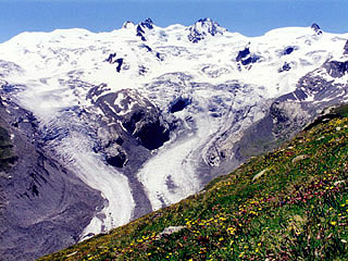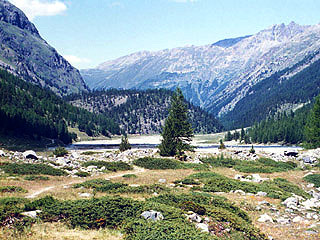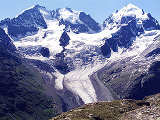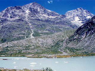 | 小一時間の小休止の後、最終目的地のホテル・ロゼックに向かって歩きだしました。しばらくは湖に沿って歩きますが、やがて湖が尽きると、これまた奥に立派な氷河のある谷と合流します。この谷が、さっきスルレイ峠からきれいに見えたチエルヴァ氷河だそうです。