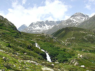 スヴレッタ峠から1時間ほど、最後に川の右岸に渡ると、川は次第に深い谷を穿ちながら登山道から離れていく。ここまで来ると、これから合流するベーヴェル谷がはるか下に見おろせるようになり、道はこれまでの緩やかな下り坂から、谷底に向けて急角度で一気に下りはじめる。周囲の風景には急に緑が増え、岩ばかり見ていた目にはホッとするような色合いだ。先程まで沿ったり渡ったりして歩いていた川は、このあたりでは何段もの滝となって流れ下り、これもまた目に美しい。