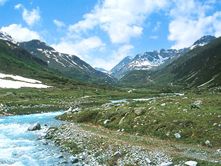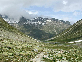 これから歩くベーヴェル谷は「花の谷」。水量たっぷりのベーヴェル川の左岸に渡ると(ここはもちろん立派な橋がかかっている)、これまではほとんど見られなかった針葉樹の木立がぽつぽつと散見されるようになる。足下のみずみずしい草と、カラマツと思われる針葉樹のやわらかい緑、そして氷河から来る水特有の乳青色をした川が轟音をたてて流れる光景は、これまでの岩の世界からやって来た目にはまた新鮮に映る。道は時折、車両の通る道と歩行者用の道に枝別れする。歩行者用の道はたいてい川の方へ下りて行くようになっており、そちらの方が圧倒的に景色がよい。