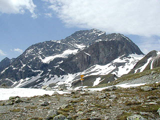 風車の近くでピッツ・ナイル山頂への道が分岐して別れて行くと、ハイカーの姿も半分以下になり、あたりはすっきりと静かになる。このあたりが本日の行程の最高地点で、ここから先、道は徐々に下りはじめる。風化が進んだガレ場と草付きを交互に繰り返しながらのんびり進んで行けば、目の前のピッツ・ユリア Piz Julier 3380mがどんどん大きく迫ってくる。名前から容易に想像できると思うが、この峰の裏側には有名なユリア峠が通っている。