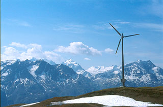 30分足らずで左手に巨大な風力発電の風車が見えて来る。人工建造物ながら周囲の風景になかなか美しく映え……と思って感心していたら、若手の空間デザイナーに環境と調和した意匠を依頼したのそうだ。いかにもデザイン大国のスイスらしい(普通の日本人にはあまり知られていないのだが、特にプロダクト/建築デザインのジャンルではスイスは突出している)。