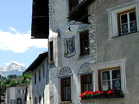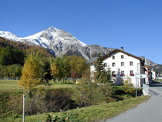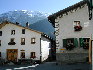 リュの村は、スグラフィット(壁に塗った石灰をひっかいて描く紋様)が施された家並みが並び、村の中を放し飼いのニワトリが駆け抜けるようなのどかな小集落。ここから郵便バスでオッフェン峠街道の町・フルデラ Fuldera へ下りることもできるが、この項ではこのまま歩き続けよう。