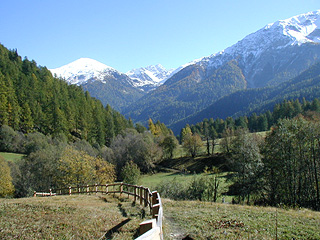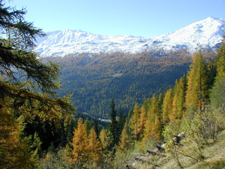 見晴らしのいい、明るい落葉松林の中のダラダラ坂を登ること30分前後、ミュスタイア谷の眺めや小動物たちの可愛らしい姿にもそろそろ飽きてきた頃、道は小さな沢とぶつかる。沢を渡らずに、流れにそってそのまま登りつめて行くと、突然目の前がパーンと開け、半ば草にうずもれたような羊背岩が点在する明るい草原に飛び出す。やがてアルプ・チャンパッチュの小屋が見えだすので、そこまでのんびり歩くと良い。