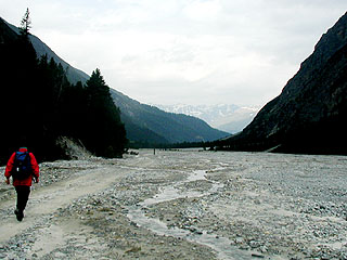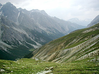 目の前には今までのミンジール谷とは打って変わった雰囲気の、岩と雪の世界が広がっている。向かいの山々の小氷河を眺めながら、急な道を下っていこう。細かい砂礫に覆われた滑りやすい道で、また、途中何度か崩壊地や雪崩道を横切るところがある。道が崩れ落ちて不明瞭になっている部分の通過は、特に慎重にしたい。なお、このあたりの砂礫地では大変珍しいヒナゲシの仲間、レーティシェ・モーンを見ることができる。