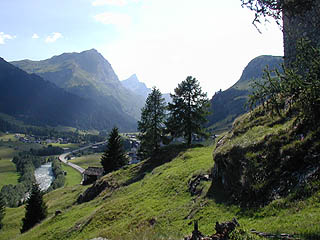 バス停から一度集落の中に入る。何ヶ所か Via Spluga(シュプリューゲン街道)と書かれた案内標識が立っているので、併記された方向表示の Spluegen をたどって行こう。やがて道は牧草地の中の舗装された一本道になる。スフェールス湖の眺めを楽しみながらしばらく行くと、山の方に登っていく道との分岐に出るが、ここで山の方に行かず、まっすぐ進むと舗装が終わり、歩きやすい白砂の道になる。このへんで一旦牧草地は終わり、明るい針葉樹林の中に入っていく。