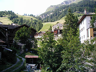 適当に一息ついたらもとの道に戻り、ふたたび標識にしたがって牧草地の中を歩いていけば、15分ほどでシュプリューゲンの村に到着。この村は伝統的な家並みで知られる雰囲気のいい村で、素通りするのは惜しい。少しくらい時間を設けて見物していくとよいだろう。