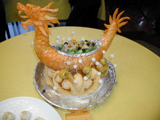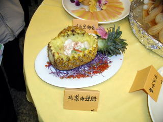 | 他の参加者の出品 南瓜の龍の器に海鮮の炒め物が。大会の出品作には凝った器を使うのが多く見られました。 |