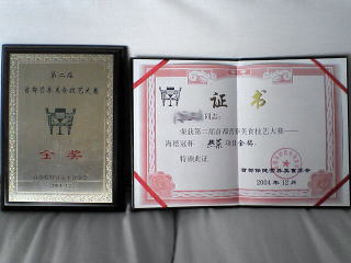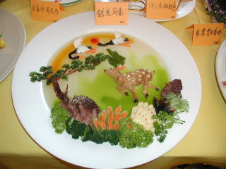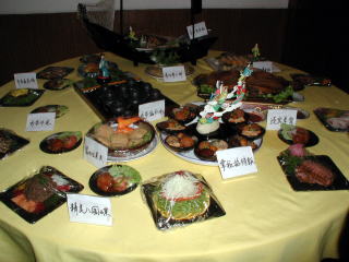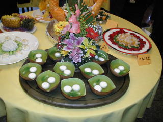 日本語料理コースの先生をしている張さんが出品した「海老とアロエのフライ」です。海老のすり身とアロエベラをオブラートで包んでパン粉付けしたという手の込んだ一品。 皿の上には弟子のヨウエンが作った麺細工の牛や漁師が飾られています。 |