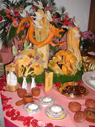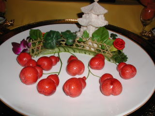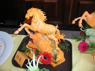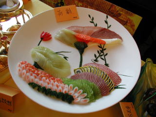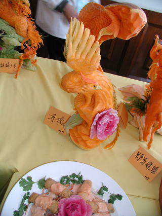 これが私の出品した「サーモン海苔巻きフライ」です。 洋食の感じがしますが、れっきとした中華です。見た目はともかく、味は自称ナンバーワンを確信してます。 中央の牡丹は夜なべして彫り上げました。 |