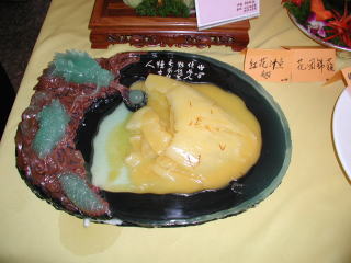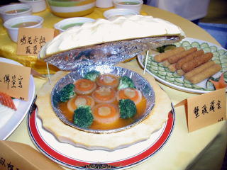 広東料理コースの王老師作「巨大ふかひれのクリーム煮」 出展作品の中でもこんなに大きなふかひれを使っているのはなく、味よりも先に原価が気になりました。20センチ近くはありましたので…。 サフランで色をつけています。 |
