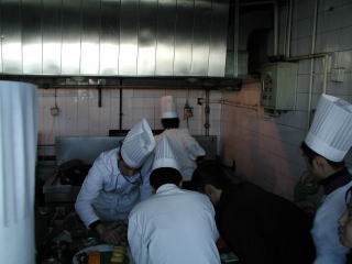 実技会場 順番が決まっているわけではなく、コンロをとるのにも一苦労でした。 「早くしろ!」などの声が飛び交っていましたが、完全無視。私は落ち着いて調理をすることができました。 |