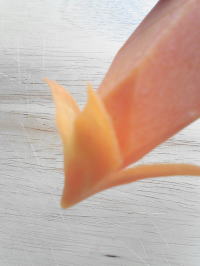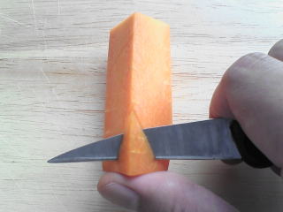 どの国の料理にも彩りをよくするために、野菜の付けあわせを料理に盛り付けますが、中国式の飾りつけは派手目になっています。 料理の高級度が増すにつれて平面的な飾り付けから立体的な手の込んだ飾り付けになるのですが、究極の飾り付けがこの食品彫刻です。 これは食べると言うよりはむしろ見て楽しむと言ったもので、料理の飾りつけと言うよりは、見た目だけを追求したオブジェのようなものと言った方が良いのかもしれません。 そんな食品彫刻ですが、中華の世界ではしっかりとしたジャンルが確立されていて、VIPの宴会や、様々な大会で技術が競われています。→アルバム(調理大会orその他の料理) ここでは、見た目だけを追求してもしょうがないので、簡単に作れて、もちろん食べられる食品彫刻を紹介します。 ニンジンの花・・・用意するもの ニンジン、小刀 |