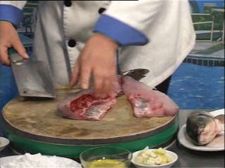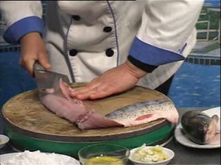 魚の頭は、あごの方から刃を入れて開いておきます。