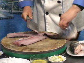 E尻尾のほうまで斜めに切り目を入れたら、今度は包丁を縦に起こして、Cの切り目に対して斜めに切り目を入れていきます。