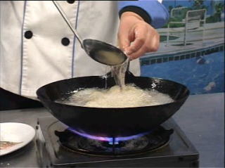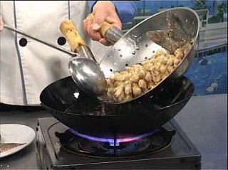 H余分な粉を叩いて落としてから、180度の油で揚げます。身が外側に向くようにし、尻尾は上向きになるようにして油に入れていきます。