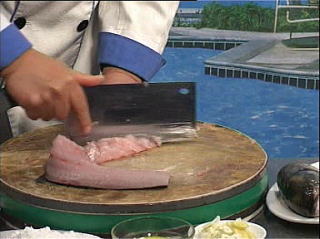 A3枚に下ろしますが、完全に3枚にはせず、尻尾のところでつなげておきます。まずは片側から。