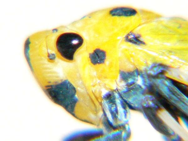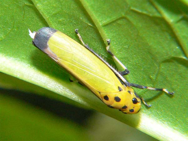 | 分類 | カメムシ目・オオヨコバイ科 | 解説 | 前翅は黄緑色で先端が黒い。頭は黄色く数個の黒い斑点がある。低山地の林やその周辺で普通に見られる。飛ぶ速度は遅く、すぐに近くの草や木の葉などにとまる。クワ科のクワ、ツバキ科のチャなどを害することがある。成虫で越冬する。 |