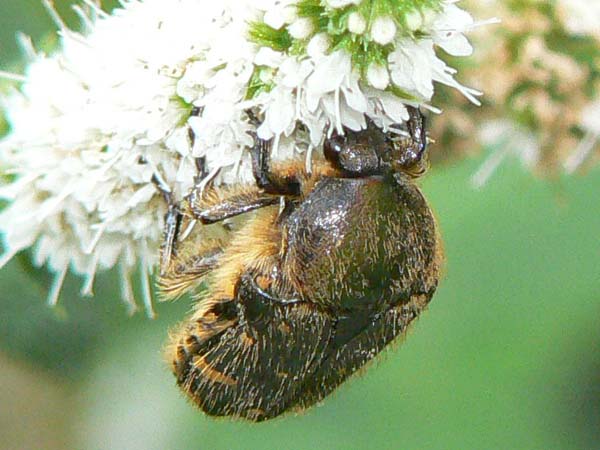 | 分類 | コウチュウ目・コガネムシ科 | 解説 | 林周辺などや都会の公園でも普通に見られる。色々な花に集まり、花粉や蜜を食べる。樹液にも集まる。幼虫は朽木、落ち葉、腐葉土などを食べる。体の周りにはたくさんの毛が生え、背中の白い斑点には個体差があるようだ。 |