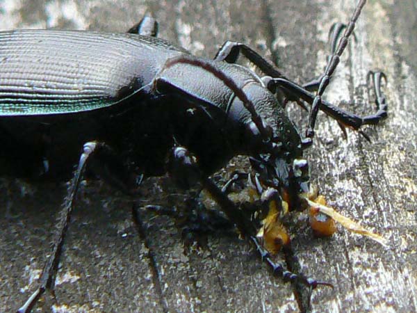 | 分類 | コウチュウ目・オサムシ科 | 解説 | 主にガの幼虫を食べる。上翅の外側は薄い緑色で縁取られる。 |