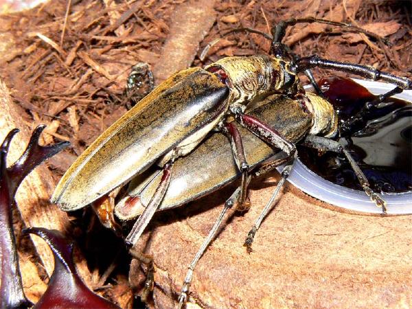 | 分類 | コウチュウ目・カミキリムシ科 | 解説 | 日本で最も大きいカミキリムシの一つ。夜行性で、夜間にクヌギやコナラなどの樹液に集まる。幼虫はクヌギやコナラ、クリなどの木の中に棲み、それを食べる。 |