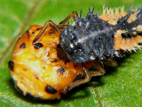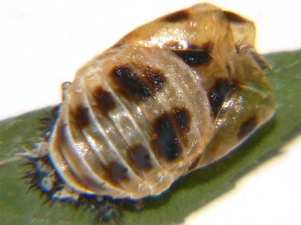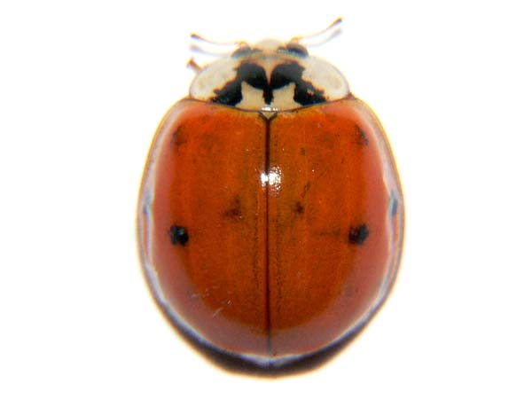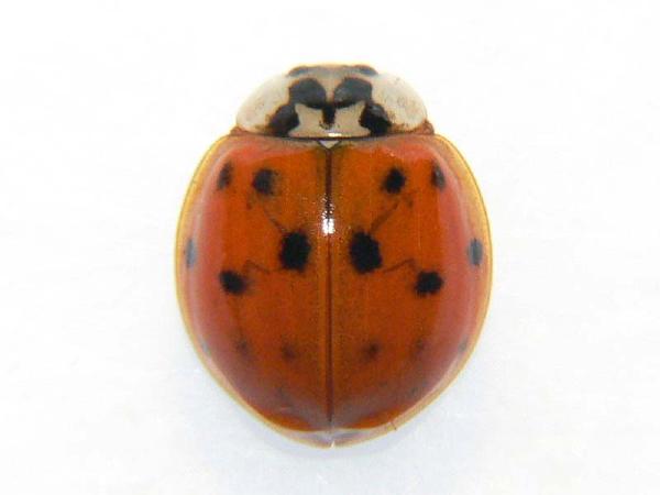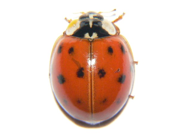 | 分類 | コウチュウ目・テントウムシ科 | 解説 | 日当たりのよい草原などや、住宅地でも普通に見られる。肉食性で成虫、幼虫とも植物に着くアブラムシなどを食べる。色や斑点の形状、斑点の数の変異が著しい。樹皮の隙間や人家などに入り込んで集団で越冬する。「テントウムシ」とも言う。 |