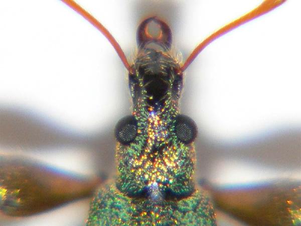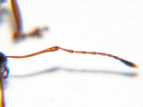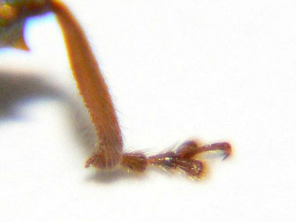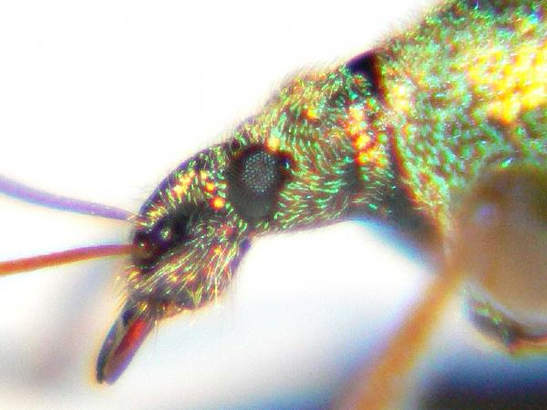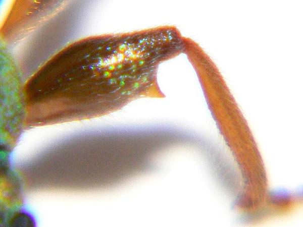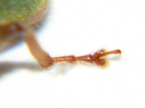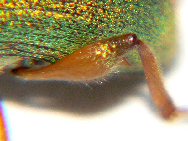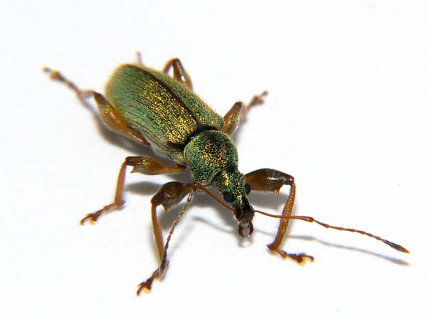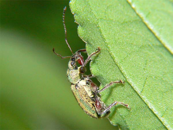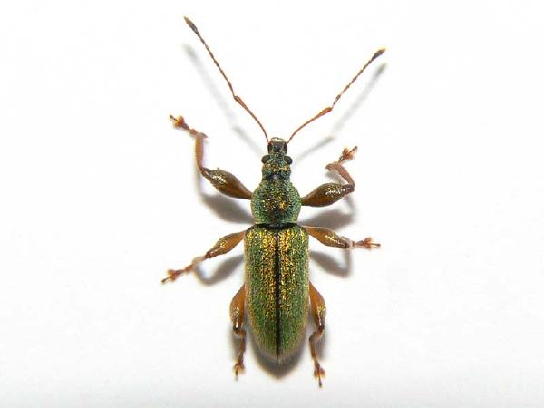 | 分類 | コウチュウ目・ゾウムシ科 | 解説 | 体は黄緑色が輝く。脚の内側には刺状の突起がある。 |